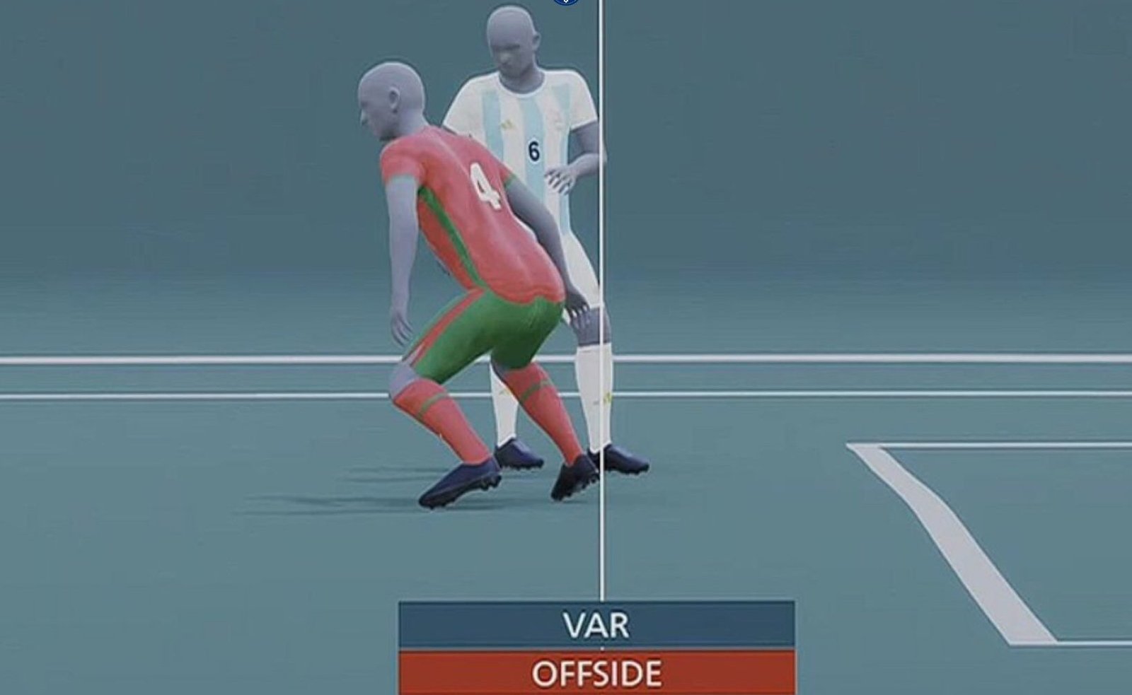 Más de una hora y cuarenta minutos después del gol de Medina, se mostró en la transmisión oficial que el VAR había detectado una posición adelantada de Bruno Amione en la jugada previa al gol. Esto llevó a que los jugadores de Marruecos y Argentina volvieran al campo de juego para calentar, a la espera de la decisión final.