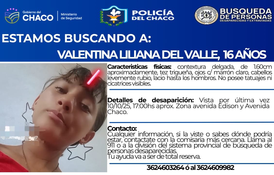 Valentina Liliana del Valle, de 16 años, se encuentra desaparecida desde el pasado 10 de octubre, cuando fue vista por última vez alrededor de las 17:00 en la intersección de avenida Edison y avenida Chaco, en Resistencia.