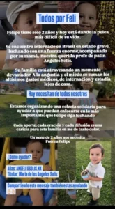 Para acompañar el tratamiento y sostener estos costos, allegados a la familia han lanzado una campaña solidaria. “Necesitamos ayuda para sostener los gastos allá mientras esperamos que Felipe esté en condiciones de volver”, manifestaron desde su entorno.